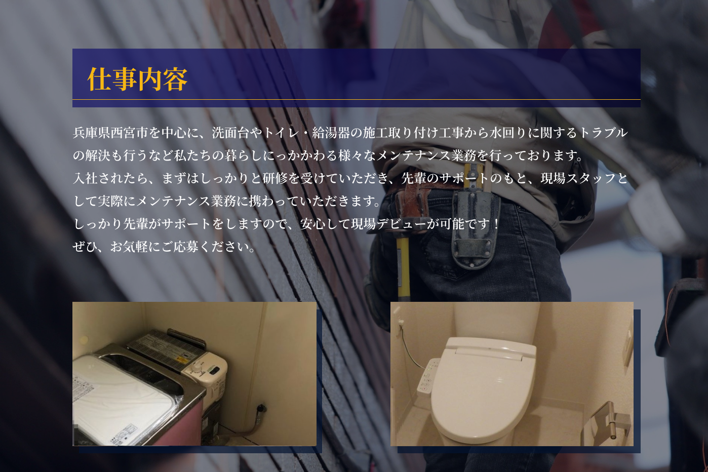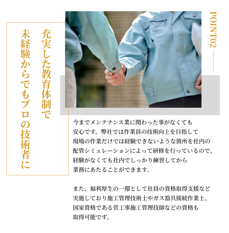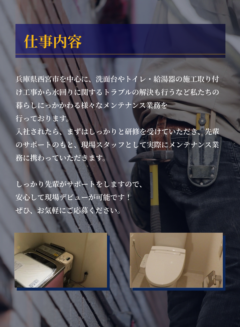 | 応募資格 | ①未経験者 ②施工管理技士1.2級or給水装置工事主任技術者いずれかの有資格者で、設備・リフォーム経験が3年以上 |
