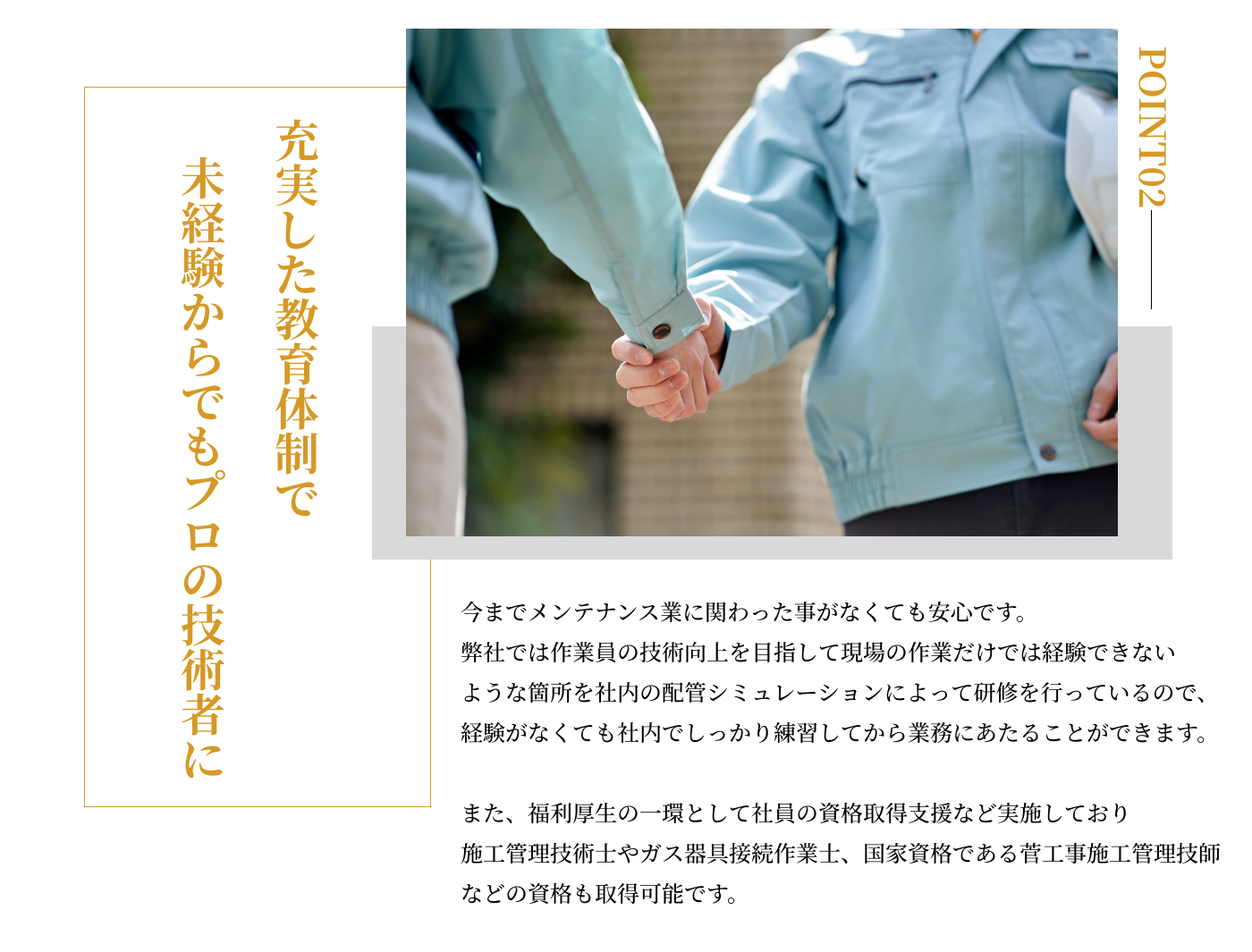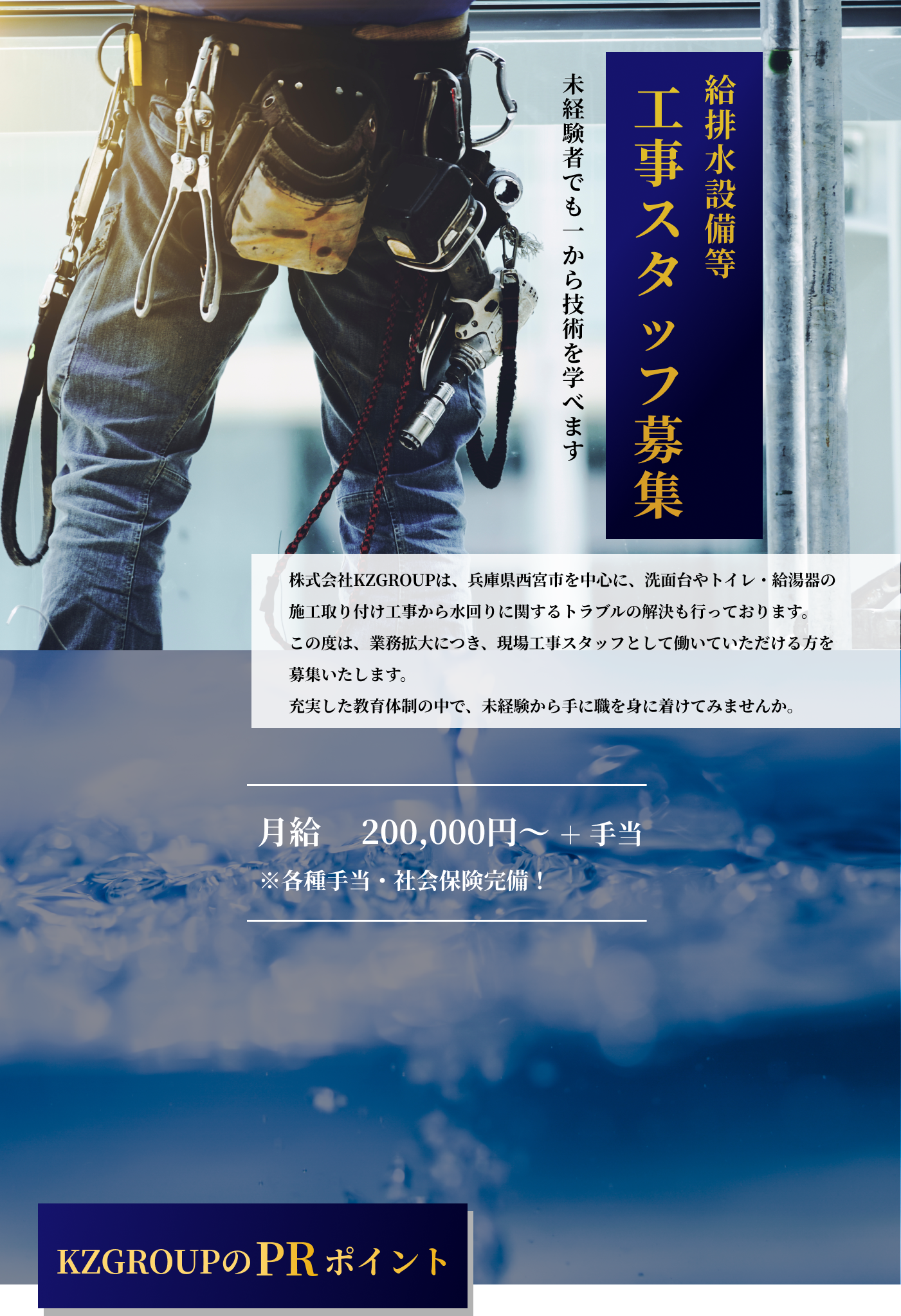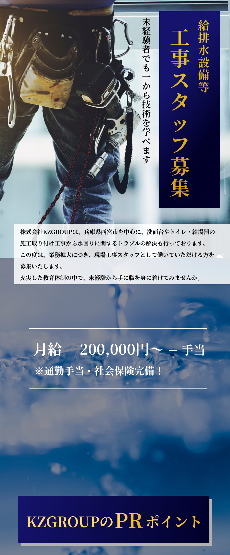 | 応募資格 | ①未経験者 ②施工管理技士1.2級or給水装置工事主任技術者いずれかの有資格者で、設備・リフォーム経験が3年以上 |